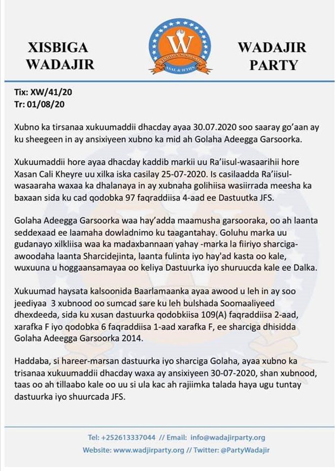 Halkaan hoose ka akhriso bayaan kasoo baxay xisbiga Wadajir.