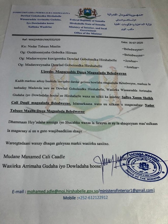 Sabti, Agoosto 1, 2020 (HOL) - Wareegto kasoo baxday xafiiska wasiirka arrimaha gadaha iyo dowladaha hoose ee maamulka Hirshabeelle ayaa waxaa xilkii looga qaaday duqii degmada Beledweyne Safiyo Xasan Shiikh Cali Jimcaale, waxaana xilkaasi loo magacaaby Nadar Tabaax maalin .