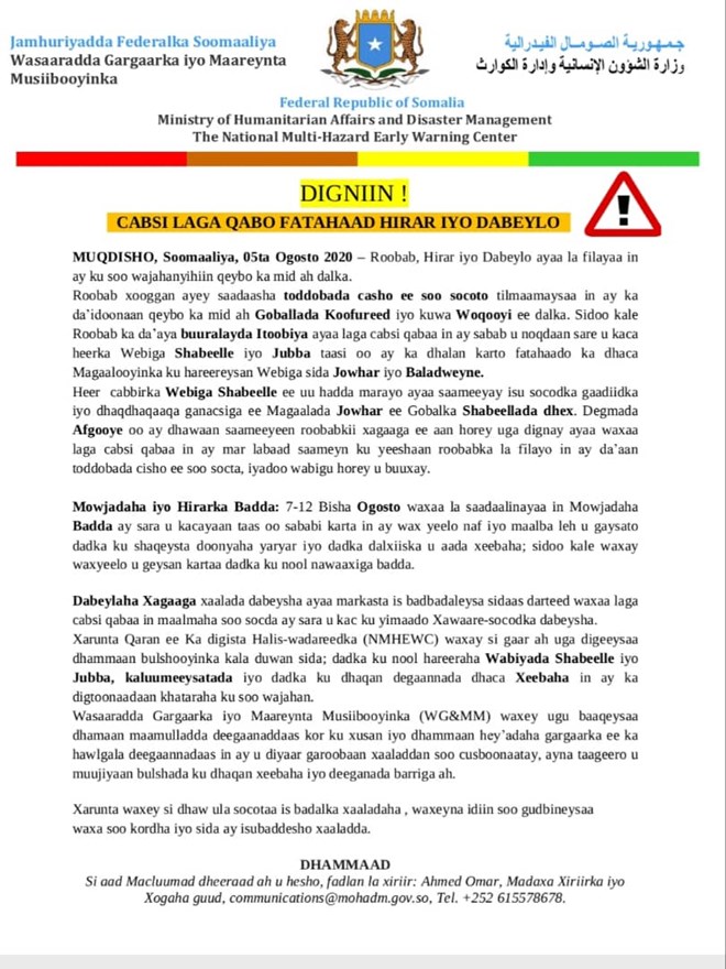 Arbaco, Agoosto 5, 2020 (HOL) - Wasaaradda gargaarka iyo maaraynta masiibooyinka ee dowladda Soomaaliya ayaa soo saartay digniin sheegaysa in toddobada cisho ee soo socota (7 to 12 Aug, 2020) ayaa saadaashu tilmaameyso roob xooggan oo kusoo wajahan goballada koofureed iyo kuwa woqooyi ee dalka.