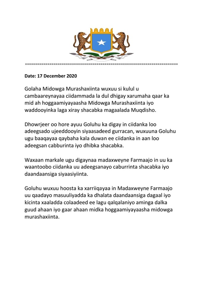 Dhinaca kale War ka soo baxay midowga musharixiinta ayaa tallaabadan ay qaaday dowladda ku tilmaamay daan-daansi dagaal, waxaana ay sheegeen in madaxweyne Farmaajo qaadanayo mas'uuliyada cawaaqibka ka dhaqan kara dhaqdhaqaaqyada militari ee socda.