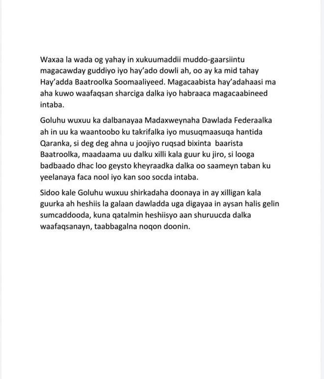 Sabti, December, 05, 2020 (HOL) - Golaha Midowga Musharaxiinta ayaa warsaxaafadeed ay soo saareen waxay walaac kaga muujiyeen Wasaaradda Batroolka iyo Macdanta oo ay ku eedeeyeen inay ku howlan tahay bixinta ruqsadaha baarista Shidaalka, xilli lagu jiro marxalad doorasho.