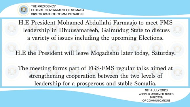 Sabti, Luulyo 18, 2020 (HOL) - Madaxweynaha dowladda federalka Soomaaliya Maxamed Cabdullaahi Farmaajo ayaa galabta gaaraya magaalada Dhuusamareeb ee caasimadda Galmudug.