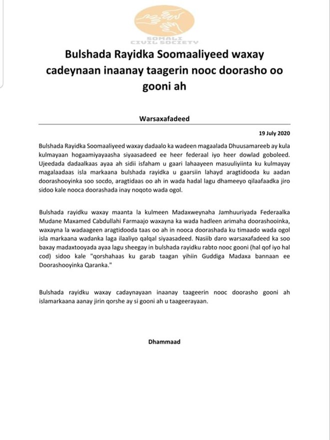 Axad, Luulyo 19, 2020 (HOL) - Dallada bulshada rayidka ah ee Soomaaliya ayaa iska fogeeyay inay taageereen nuuc kamid ah doorashada Soomaaliya, intii lagu guda jiray kulan ay Dhuusomareeb kula qaateen madaxweyne Farmaajo.