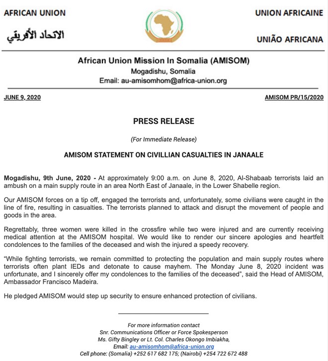 “Nasiib darro, saddex haween ah ayaa ku dhintay is-rasaaseynta halka laba kalena ay ku dhaawacmeen oo hadda ay daryeel caafimaad ka helayaan isbitaalka AMISOM. Waxaan jeclaan lahayn inaan tacsi u jeedinno ehelladii marxuumiintaa waxaan u rajeyneynaa kuwa ku dhaawacmay si dhaqso leh usoo kabtaan,’ ayaa lagu yidhi bayaanka Midowga Afrika.