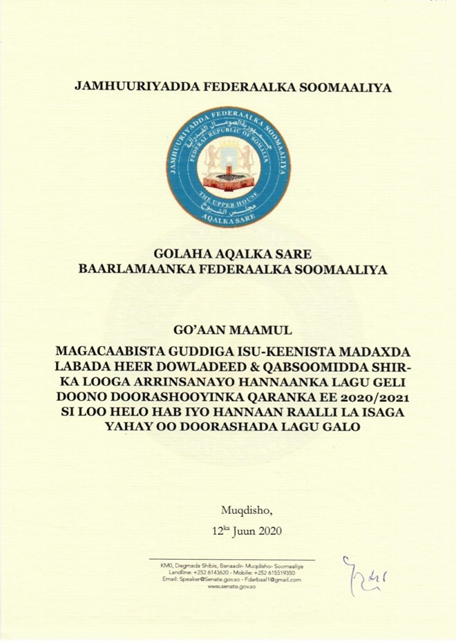 Jimco, Juun 12, 2020 (HOL) - Guddoomiyaha aqalka sare ee Soomaaliya ayaa magacaabay guddi ka kooban sagaal xubnood oo ka shaqeyndoona sidii ay iskugu keeni lahaayeen madaxda dowladda federalka iyo dowladdaha xubnaha ka ah.