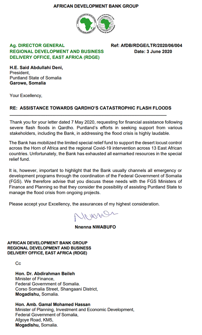 Sabti, Juun 06, 2020 (HOL) - Madaxweynaha Puntland Siciid C / llaahi Deni oo kaalmo lacageed ka codsaday Bangiga Horumarinta Afrika, si looga jawaabo daadadkii Qardho ayaa laga diiday codsigaas ka dib markii Bankigu xusuusiyay hoggaamiyaha Puntland in uu soo maro Dowladda Federaalka.