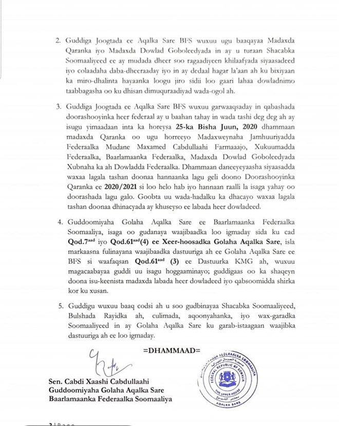 Talaado, Juun 09, 2020 (HOL) - Barlamaanka aqalka sare ee Soomaaliya ayaa ku baaqay in 25 june dowladda federalka iyo dowladdaha xubnaha ka ah iskugu yimaada wada tashi degdeg ah oo looga arinsanayo doorashooyinka qaran ee soo socoda.