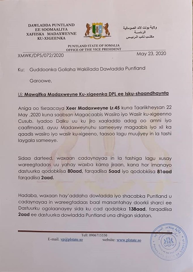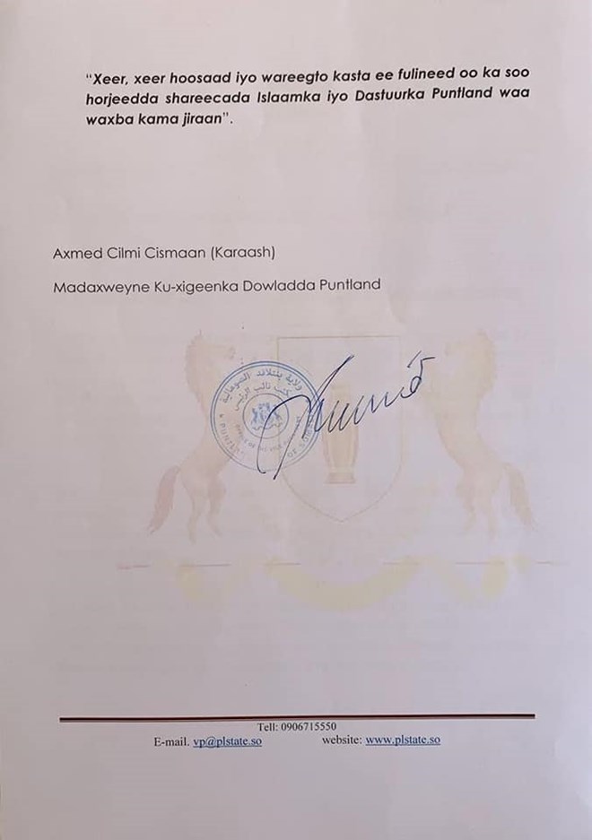 newsinsideQoraal kasoo baxay madaxweyne ku xigeenka ayaa lagu sheegay in aanu wax wada tashi ah ku lahayn magacaabidda islamarkaana wuxuu madaxweynaha ku eedeeyay inuu ka xadgudbay dastuurka Puntland.