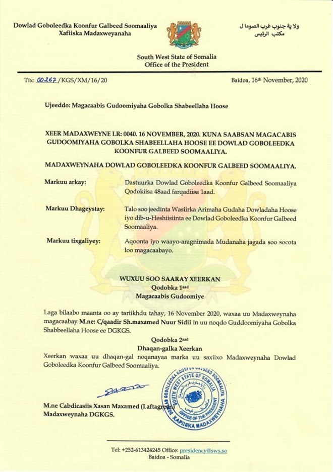 Isniin, November, 16, 2020 (HOL) - Madaxweynaha dowlad goboleedka koonfur galbeed, Cabdicasiis Lafta-gareen ayaa guddoomiyaha gobolka Shabeellada hoose u magacaabay C/qaadir Sheikh Maxamed Nuur Siidi oo horey xilkaan usoo qabtay.