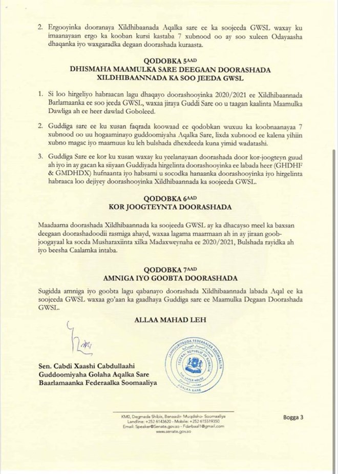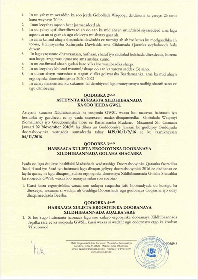 Sida ka muuqata qoraalkaan, guddoomiyaha aqalka sare ayaa ku adkaysanaysa in habraaca doorashada xildhibaanada gobolada waqooyi loo marayo hannaanka ay ku yimaadeen sanadkii 2016.