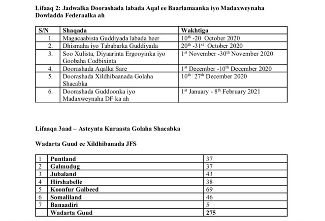 Khamiis, October 1, 2020 (HOL) - Jadwalka doorashada ka dhacaysa dalka 2020/2021 ayaa rasmi ah loo soo saaray, ka dib markii hannaanka ay doorashada ku dhacayso ay ka heshiiyeen Dowladda Federaalka, dowlad-gobolleedyada iyo Gobolka Banaadir.