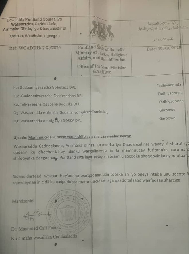 newsinsideQoraal kasoo baxay wasaaradda cadaaladda iyo arrimaha diinta ee maamulka Puntland, ayaa lagu sheegay, in loo mamnuucay si loo saxo shaqooyinka ay qabtaan shifooyinka.