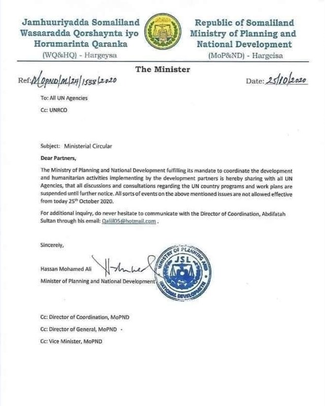 Isniin, October, 26, 2020 (HOL) - Xukuumada Somaliland ayaa shaacisay inay hakisay dhammaan barnaamijyadii iyo qorshayaashii shaqo ee hay’addaha Qaramada Midoobay ka wadeen degaanadeeda.