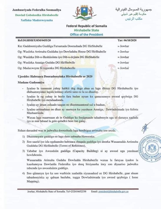 Talaado, October 6, 2020 (HOL) - Madaxweynaha dowlad goboleedka Hirshabelle Maxamad Cabdi Waare ayaa kasoo horjeestay jadwalka doorashooyinka ay maanta soo bandhigeen guddiga farsamadda iyo soo xulista Baarlamaanka Labaad ee maamulka Hirshabelle.