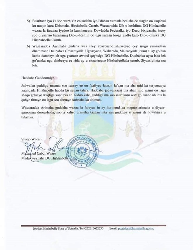 Qoraalka kasoo baxay Madaxweyne Waare ayaa sidoo kale lagu sheegay in loo baahan yahay dhismaha cusub ee Hirshabelle inaysan noqonin mid lagu deg dego sidii loogu deg degay dhismahedii koowaad oo kale loona baahan yahay in la dhiso Hirshabelle Caafimaad qabto.