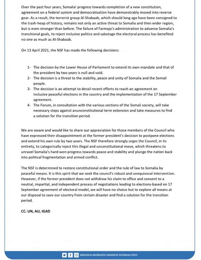 Talaado, April, 20, 2021 (HOL) - Madasha Badbaado qaran oo aay ku mideysan yihiin Midowga musharaxiinta, maamulada Puntland, Jubbaland iyo golaha siyaasiyiinta Somaliland ayaa fariin cusub u diray Golaha Amaanka Qaramada Midoobay oo lagu wado iney maanta shir ka yeeshaan xaalada siyaasadeed ee dalka Soomaaliya.