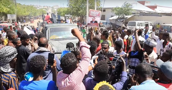 Dibadbaxayaasha ayaa ku qeylinaya erayo aay ka mid yihiin, doonimeyno Farmaajo iyo hadhaco Farmaajo, waxayna banaanbaxayaasha laamiga ku dhex gubayeen taayaro waaweyn.