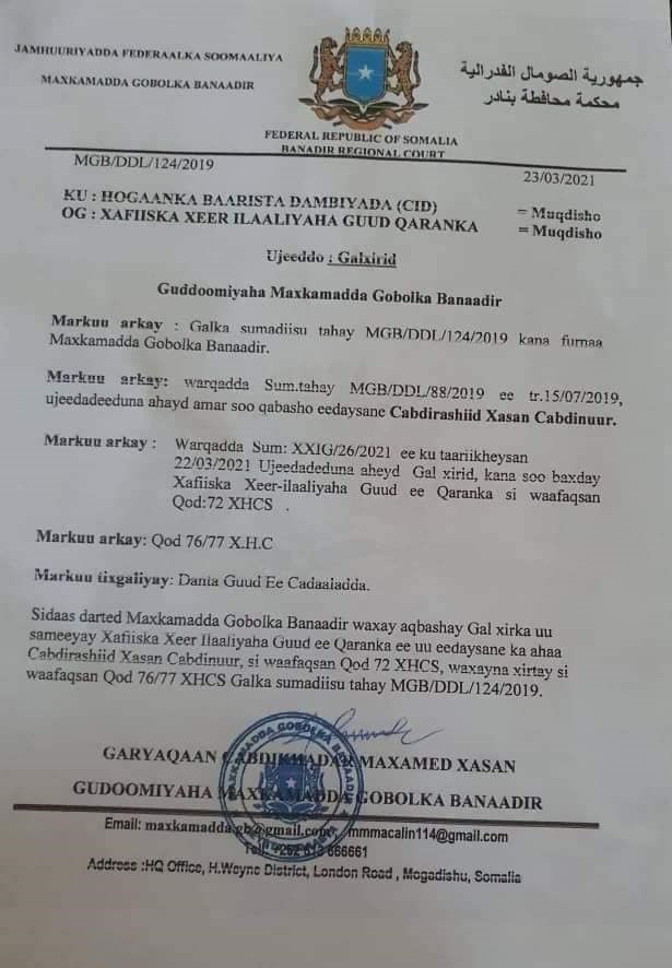 Maxkamadda gobolka Banaadir oo Janan dacwaddiisu iyo amar soo qabashadiisu ay taalay, ayaa aqbashay go'aanka lagu xiray kiiskaas.