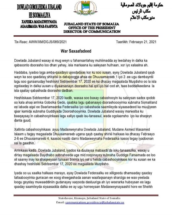 newsinsideWarsaxaafadeed kasoo baxay madaxtooyada Jubbaland ayaa lagu sheegay, in Jubbaland dalbanayso in dowladdu marka hore garowshiyo iyo raalli-galin ka bixiso, waxay ugu yeereen tallaabooyin guracan oo dowladdu u geysatay saamileyda siyaasada iyo muwaadiniinta.