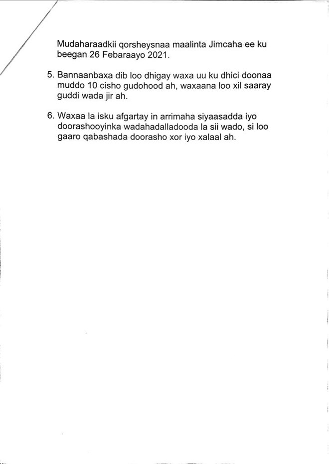 Khamiis, Feberaayo, 25, 2021 (HOL) - Warmurtiyeed ka kooban ilaa lix qodob ayaa ugu danbeyntii laga saaray shir saacado badan qaatay oo Hotel Decale ee magaalada Muqdisho uga soconayay Ra'iisal Wasaaraha Xukuumadda Soomaaliya Maxamed Xusseen Rooble iyo midowga Musharixiinta.