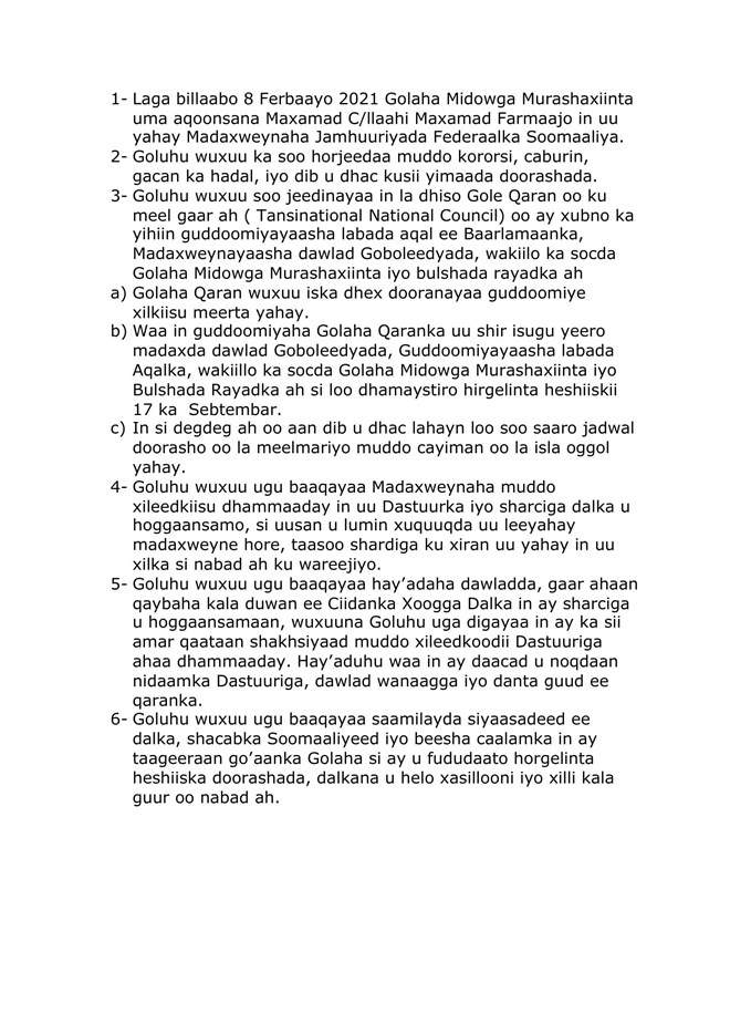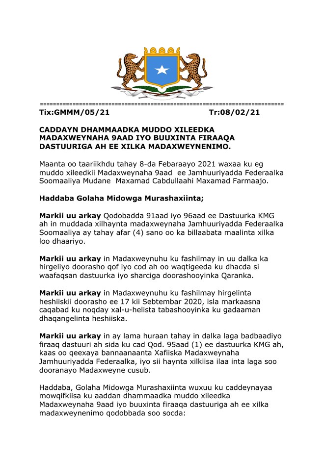 Isniin, Feberaayo, 08, 2021 (HOL) - Iyadoo maanta uu ku eg yahay muddo xileedka madaxweynaha Soomaaliya Maxamed Cabdullaahi Farmaajo oo ay afar sano u buuxsantay ayaa war ay soo saareen midowga Musharixiinta waxaa ay ku sheegeen in laga bilaabo maanta aysan u aqoosaneyn Farmaajo madaxweynaha Jamhuuriyada Soomaaliya.