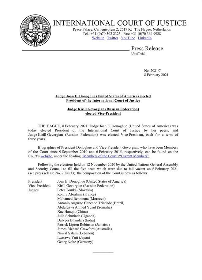 Garsoore Kirill Gevorgian oo kasoo jeeda dalka Ruushka  ayaa isagana loo doortay Madaxweyne ku xigeenka maxkamada ICJ, mid walbana waxaa loo doortay saddex sano inuu xafiiska joogo..