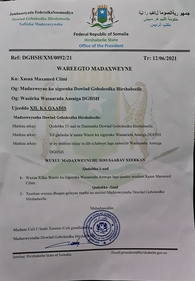Axad, Juun, 13, 2021 (HOL) - Madaxweynaha maamul goboleedka Hirshabeelle Cali Cabdullaahi Xuseen ayaa xilka qaadis ku sameeyay wasiir ku xigeenkii Amniga maamulka Hirshabeelle Xasan Maxamed Cilmi.