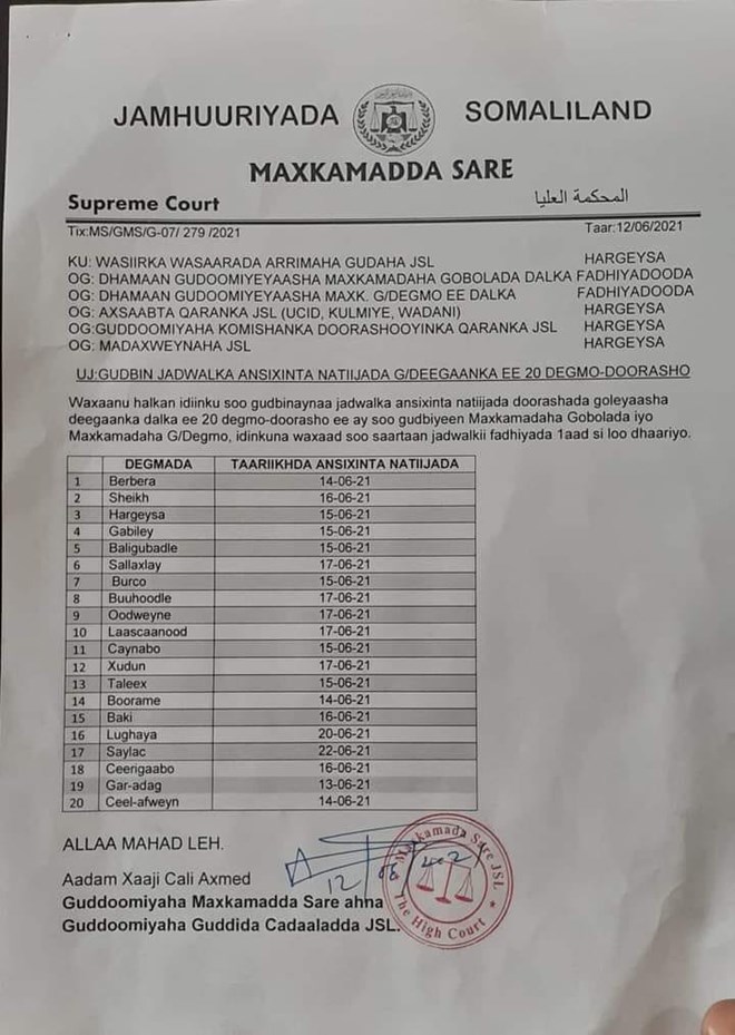 Axad, Juun, 13, 2021 (HOL) - Maxkamada sarre ee Somaliland oo dhawaan loo gudbiyay natiijadii hordhaca ahayd ee doorashada golayaasha deegaanka iyo wakiilada, ayaa soo saartay jadwalka ansixinta golayaasha deegaaka cusub.