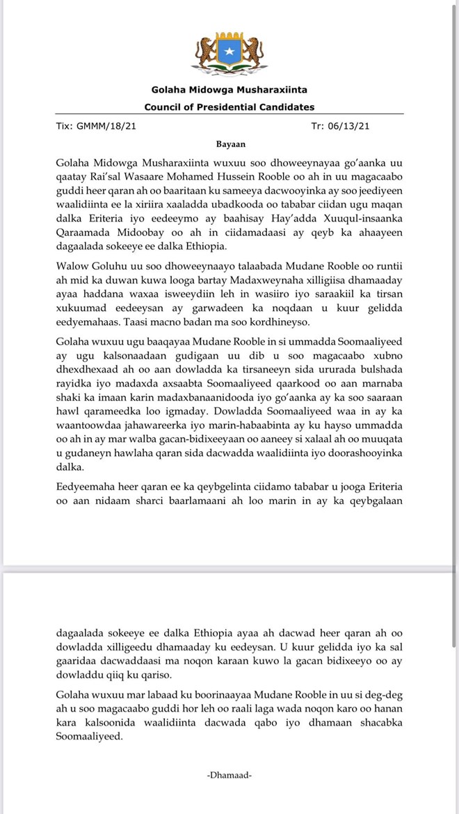 Isniin, Juun, 14, 2021 (HOL) - Golaha Midowga Musharaxiinta madaxweynaha Soomaaliya ayaa bayaan kasoo saaray guddigii maalin ka hor uu magacaabay Raysal wasaataha Soomaaliya Maxamed Xuseen Rooble iney baaritaano kusoo sameeyaan xaalada aay ku sugan yihiin ciidankii tababarka loogu qaaday dalka Eriteria, kuwaas oo la sheegay in laga qeyb galiyay dagaalo ka dhacay gudaha dalka Itoobiya.