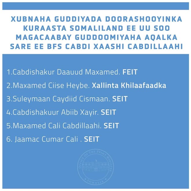 newsinsideWareegto kasoo baxday Xafiiska guddoomiye Cabdi Xaanshi ayaa lagu magacaabay guddiyada labada heer ee doorashooyinka iyo waliba kuwa xalinta khilaafaadka, waxaana si toos ah loogu gudbiyay xafiiska Raysal wasaaraha Soomaaliya Maxamed Xuseen Rooble.