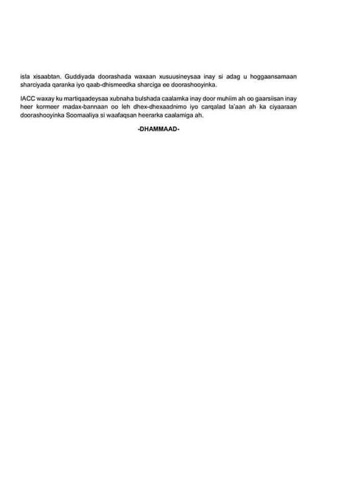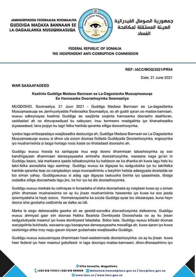 Talaado, Juun, 22, 2021 (HOL) - Guddiga madaxa-bannaan ee la-dagaalanka musuq maasuqa ayaa soo saaray war-saxaafadeed digniin ah oo uu ku caddeynayo awoodiisa iyo kaalinta uga aadan hanaanka loo qabanayo doorashoyinka dalka.