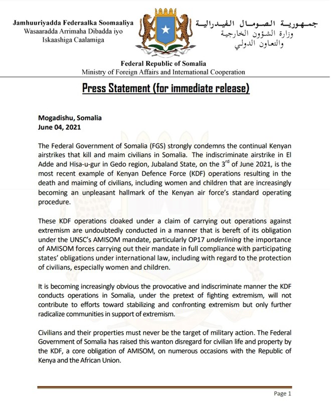 "Dowladda Federaalka Soomaaliya (FGS) waxay si adag u cambaareyneysaa duqeymaha joogtada ah ee ay geysanayaan diyaaradaha dagaalka Kenya ee lagu dilayo laguna dhaawacayo dadka rayidka ah ee Soomaaliya. Duqaymahii ka dhacay gobolka Gedo, Jubaland State, 3da Juun 2021, waa tusaalihii ugu dambeeyay ee howlgalada Ciidamada Difaaca Kenya (KDF) ee sababay dhimashada iyo curyaaminta dadka rayidka ah, oo ay ku jiraan haweenka iyo caruurta. Taas waxay astaan aan wanaagsaneyn u noqonaysaa nidaamka howlgalada ciidamada cirka Kenya." ayaa lagu yiri bayaanka.