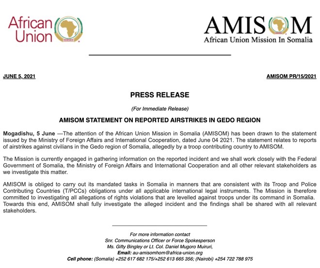 Axad, Juun, 6, 2021 (HOL) - Howlgalka Midowga Afrika ee AMISOM ayaa jawaab kasoo saaray bayaan ay soo saartay Wasaaradda Arrimaha Dibadda Soomaaliya oo ku saabsan in diyaaradaha dagaalka Kenya ay duqeymo aan kala sooc lahayn la beegsadeen dadka rayidka ee gobolka Gedo.