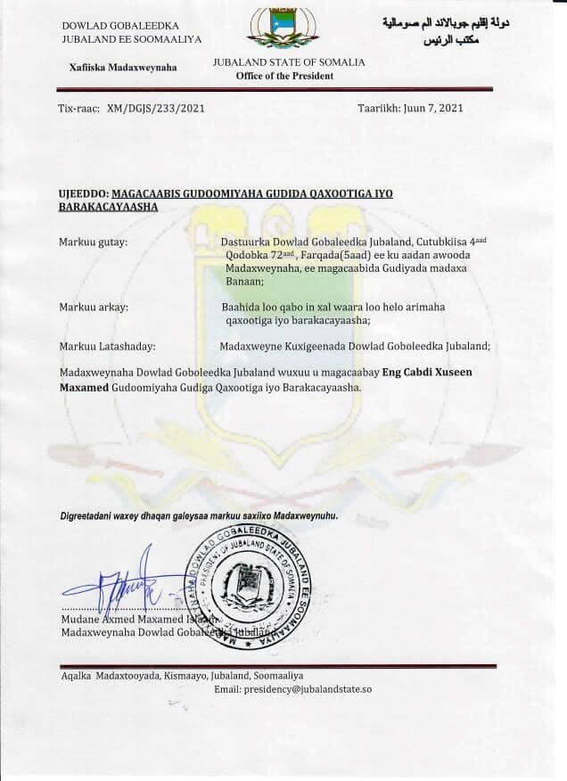 Isniin, Juun, 7, 2021 (HOL) - Madaxweynaha maamul goboleedka Jubbaland Axmed Maxamed Islaam Axmed Madoobe ayaa wareegto kasoo baxday Xafiiskiisa waxaa uu ku magacaabay guddoomiyaha guddiga qaxootiga iyo Barakacayaasha.