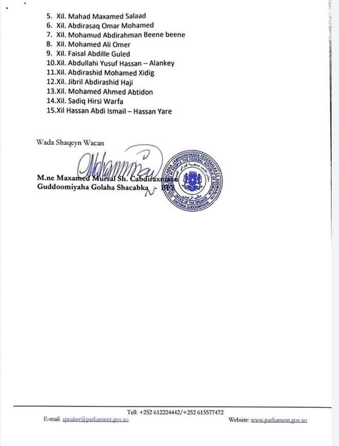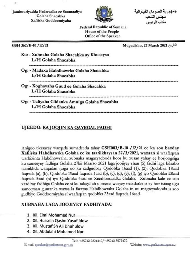 Sabti, Maarso, 27, 2021 (HOL) - Gudoomiyaha baarlamaanka Soomaaliya, Maxamed Mursal Sheikh Cabdiraxman ayaa soo saaray go'aan 15 kamid ah Xildhibaan golaha shacabka looga joojiyay fadhiyada barlamaanka ee soo socda.