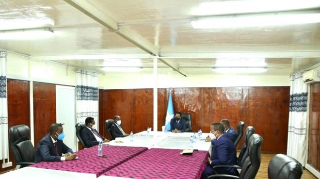 Isniin, Maarso, 29, 2021 (HOL) - Iyadoo aad moodo in khilaafka la xiriira doorashada Soomaaliya oo uu marayo halkii ugu adkeyd, ayaa waxaa xalay xarunta madaxtooyada Villa Soomaaliya shir gaar ah ku yeeshay madaxweynaha muddo xileedkiisu dhamaaday Maxamed Cabdullaahi Farmaajo, Ra'iisal Wasaare Rooble, madaxweynayaasha dowlad gobolleedyada Galmudug, Koonfur Galbeed, Hirshabeelle iyo Guddoomiyaha gobolka Banaadir.