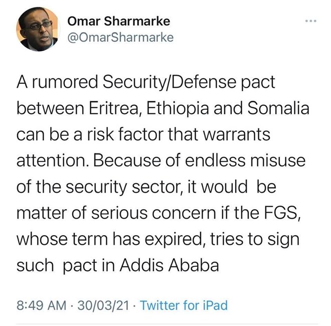 Talaado, Maarso, 30, 2021 (HOL) - Raysul wasaarihii hore ee Soomaaliya Cumar Cabdirashiid ayaa sheegay in uu jiro heshiis milatari oo dhawaan ay wada gaari doonaan Soomaaliya, Elateria iyo Ethiopia.