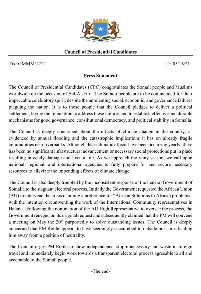 Axad, May, 16, 2021 (HOL) - Golaha midowga musharraxiinta madaxweynaha Soomaaliya ayaa sheegay in ay ka walaacsan yihiin in raysal wasaaruhu uu u muuqdo mid ka weecanaya mowqifkiisa dhexdhexaadnimo.