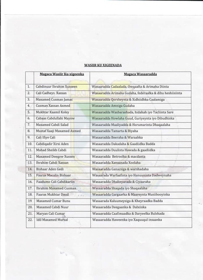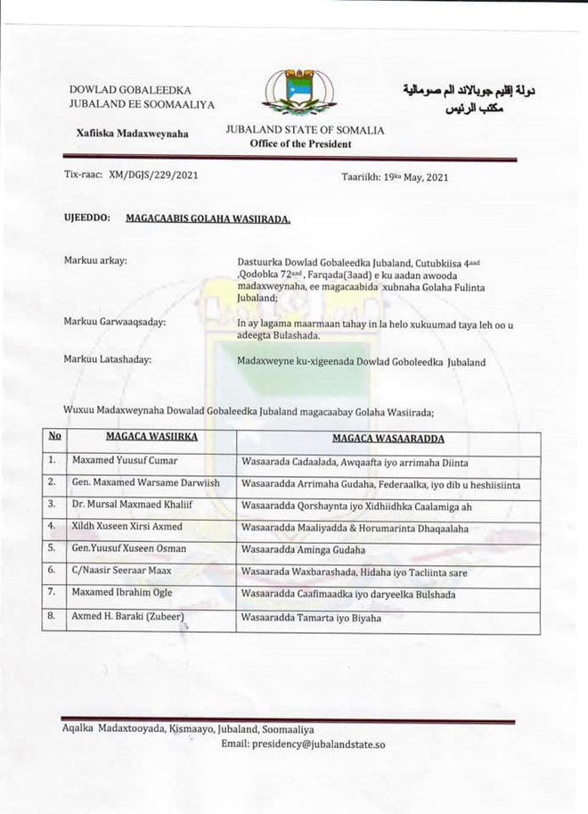 Arbaco, May, 19, 2021 (HOL) - Madaxweynaha Jubbaland, Axmed Madoobe ayaa muddo 2 sano ku dhow kadib magacaabay golihiisa wasiiradda oo ka kooban 50 xubnood oo isugu jira 23 wasiir, 22 Wasiir ku xigeen iyo 5 wasiiru udowle.