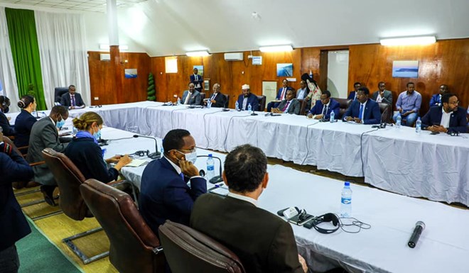 Sabti, May, 29, 2021 ( HOL ) - Ra’iisul Wasaaraha Xukuumadda Federaalka Soomaaliya Maxamed Xuseen Rooble oo ay weheliyaan Madaxweynayaasha Dowlad Goboleedyada iyo Guddoomiyaha Gobolka Banaadir ayaa kulan la qaatay Wakiilada Beesha Caalamka u jooga Soomaaliya.