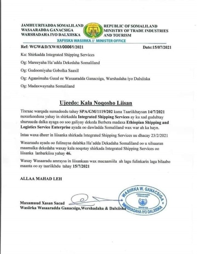Khamiis, Luulyo, 15, 2021 (HOL) - Wasaarada ganacsiga Somaliland, ayaa ruqsadi kala noqotay shirkada Integrated Shipping Services, oo ah shirkad ka shaqaysa koontiinarada iyo maraakiibta.