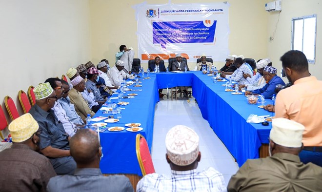 Isniin, September, 19, 2022 (HOL) - Wasiirka arrimaha gudaha iyo dib u heshiisiinta Xukuumadda Federaalka Soomaaliya Axmed Macalin Fiqi ayaa Maanta kulan wadatashi ah la yeeshay Odeyaasha dhaqanka ee maamulka Galmudug oo uu kala hadlay kaalintooda la xiriirta dib u heshiisiinta, xasilinta deegaanada laga xoreeyey Alshabaab iyo ka feejignaanta qorsheyaal ay ku doonayaan iney isaga hor keenaan beelaha Soomaaliyeed.