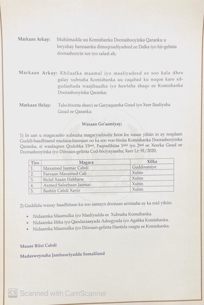 Talaado, May, 10, 2022 (HOL) - Madaxweynaha Somaliland Muuse Biixi Cabdi, ayaa magacaabay guddi 5 qof ka kooban, oo baadhis ku samayn doonta khilaafka maamul ee ka dhexeeya Guddida Doorashooyinka Somaliland.