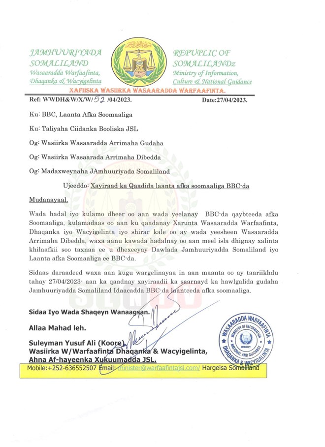 Khamiis, April, 27, 2023 (HOL) - Xukuumada Somaliland ayaa shaacisay in ay xayiraadii ka qaaday idaacada BBC-da, kadib markii ay joojisay wadashaqayntii idaacada 19, July, 2022.