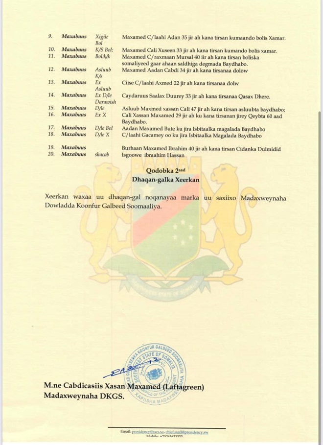 Maxaabiista uu madaxweynaha koonfur Galbeed xafiska u fidiyay oo gaaraya 20 qof, ayaa 19 kamid ah waxay yihiin askar iyo saraakiil ka tirsan qeybaha ciidamada dowladda.