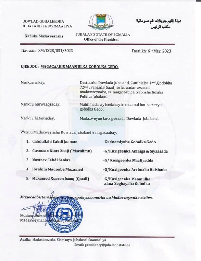 Arbaco, Juun 7, 2023 (HOL) - Madaxweynaha maamulka Jubbaland Axmed Maxamed Islaam, Axmed Madoobe ayaa maamul cusub u magacaabay gobolka Gedo oo dhowrkii sano ee lasoo dhaafay ka madax banaana maamulkiisa.