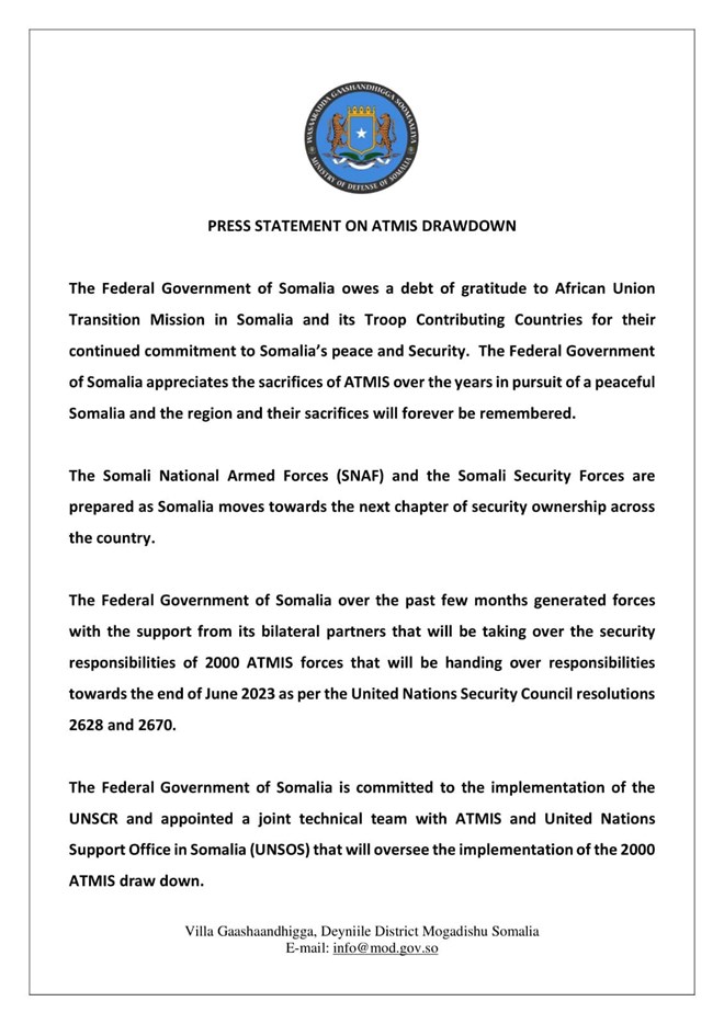 Jimco, Juun, 9, 2023 (HOL) - Wasaaradda gaashaandhigga Soomaaliya ayaa war rasmi ah  kasoo saartay dhimista tirada ciidamada ATMIS ee ku sugan dalka, iyadoo xaqiijisay in dowladdu ay ka go’an tahay inay mas'uuliyadda amniga kala wareegto ATMIS.
