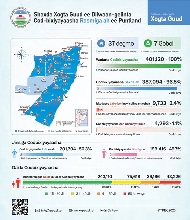 newsinside387.094 qof ayaa lagu sheegay tirada saxda ah ee iska diiwaan galisay 37 degmo oo hoos yimaada 7 gobol oo katirsan maamulka Puntland.