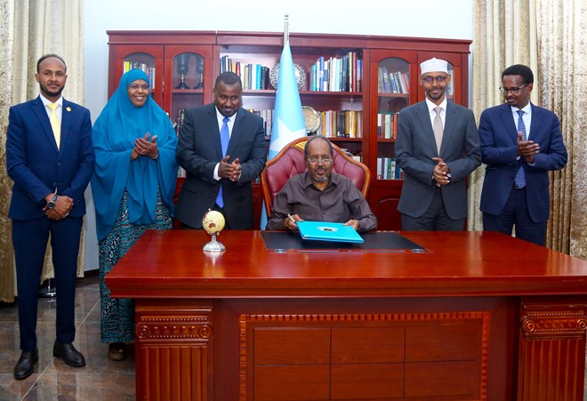 Arbaco, Maarso, 8, 2023 (HOL) - Madaxweyne Xasan Sheekh ayaa caawa saxiixay sharciga Cunaqabataynta Maaliyadeed ee Cayiman, Sharciga Hay'adda Sirdoonka iyo Nabad-sugidda Qaranka iyo Sharciga Korontada Qaranka.