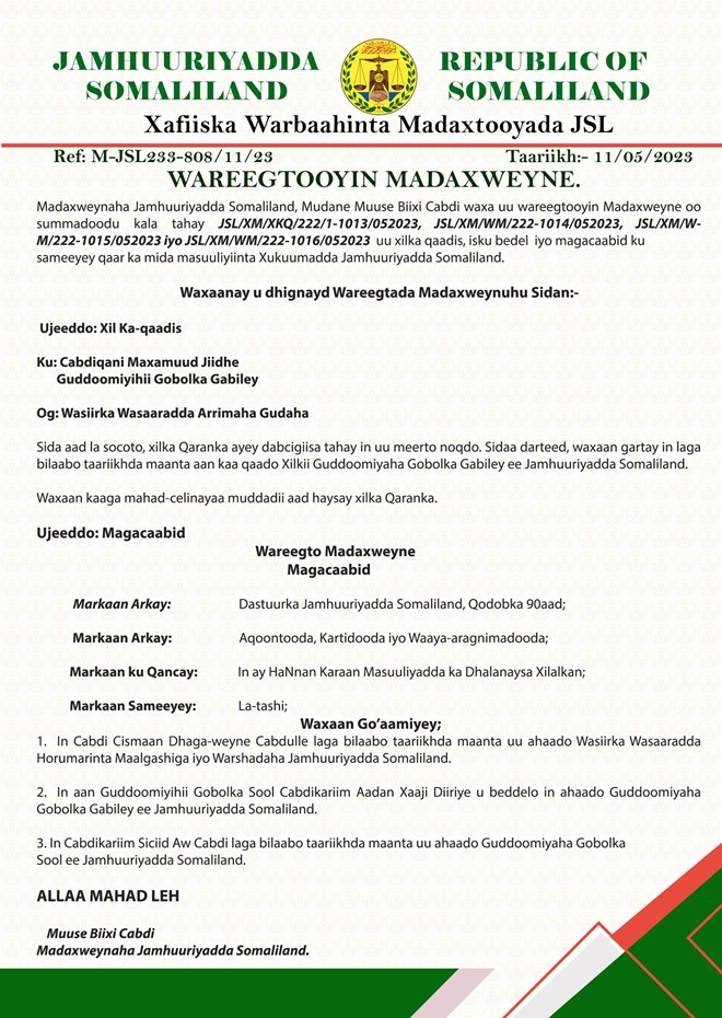 Khamiis, May, 11, 2023 (HOL) - Madaxweyaha Somaliland Muuse Biixi Cabdi, ayaa wasiir u magacaabay wasaraada maalgashiga, badhasaabkii gobolka Sool ayuu Gabilay u badalay, Sool na guddoomiye cusub ayuu u magacaabaay, sidookale badhasaabkii Gabilay ayuu xilkii ka qaaday.